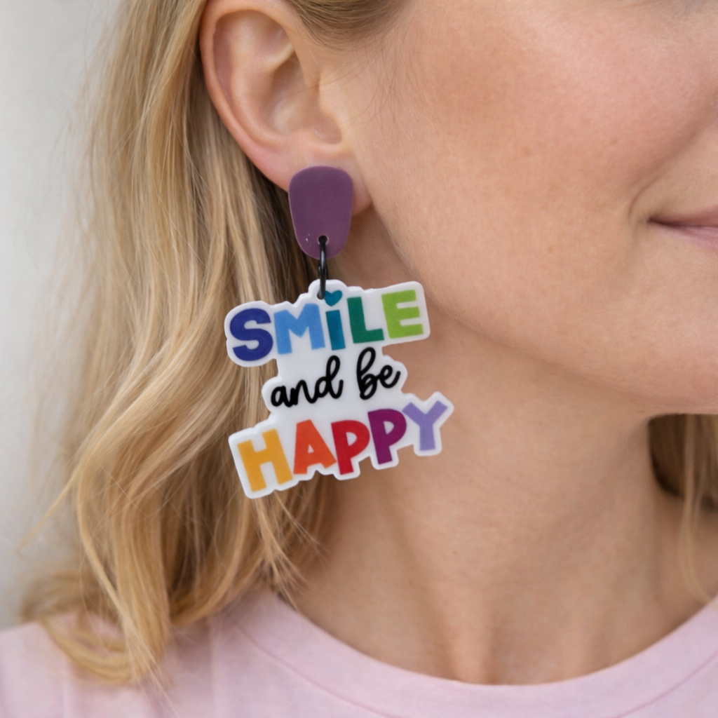 SMILE AND BE HAPPY ACRYLIC DANGLES ARE 42cm from top to bottom.